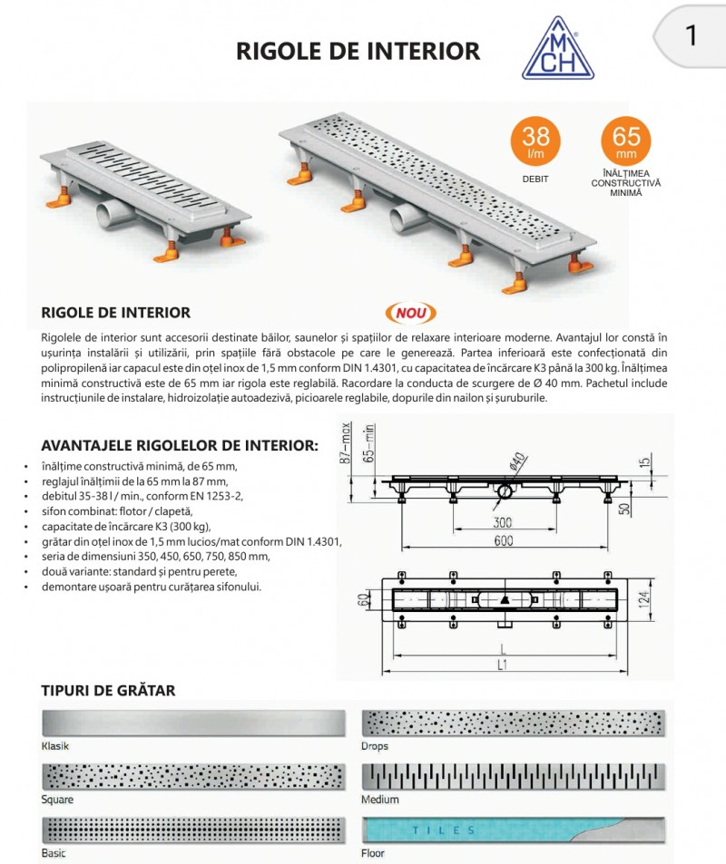 Rigolele de interior sunt accesorii destinate băilor, saunelor și spațiilor de relaxare interioare moderne. Avantajul lor constă în ușurința instalării și utilizării, prin spațiile fără obstacole pe care le generează. Partea inferioară este confecționată din polipropilenă iar capacul este din oțel inox de 1,5 mm conform DIN 1.4301, cu capacitatea de încărcare K3 până la 300 kg. Înălțimea minimă constructivă este de 65 mm iar rigola este reglabilă. Racordare la conducta de scurgere de Ø 40 mm. Pachetul include instrucțiunile de instalare, hidroizolație autoadezivă, picioarele reglabile, dopurile din nailon și șuruburile.