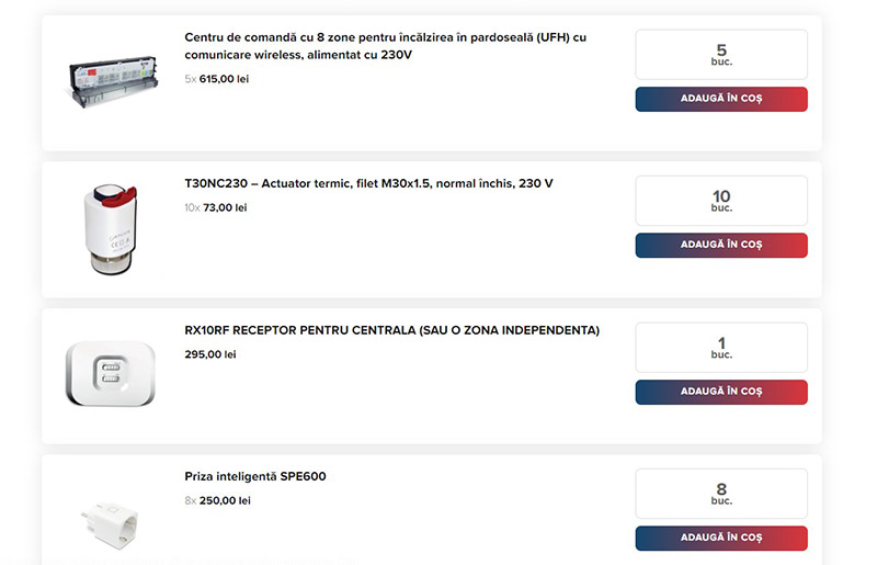 După ce ai ales câte prize inteligente să aibă sistemul, câți senzori de uși sau câte contoare de energie, poți să generezi o listă de produse necesare sistemului tău. După testul efectuat de noi, lista conținea următoarele produse: